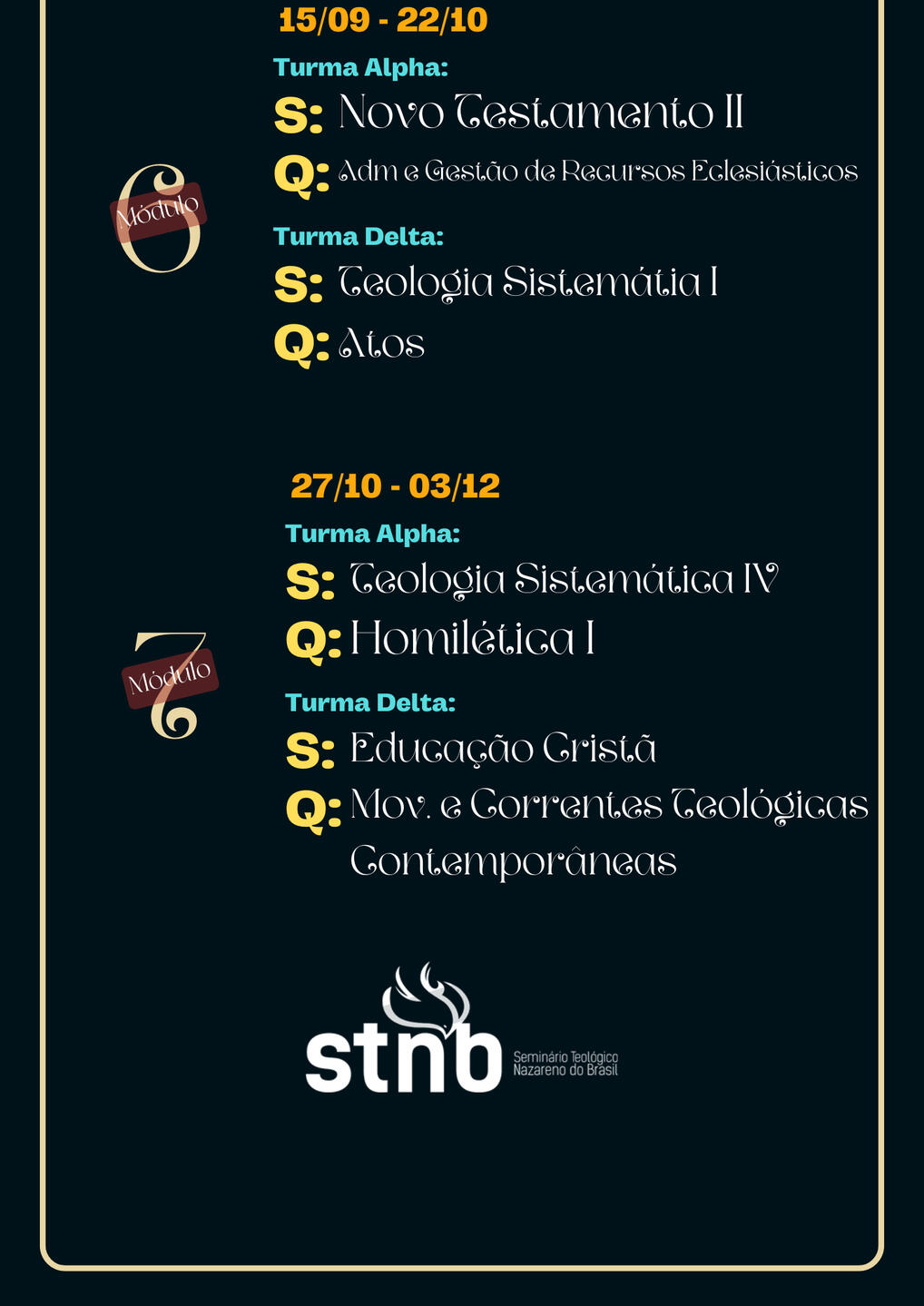 Somos uma Instituição de Educação Teológica da Igreja do Nazareno cuja missão consiste em formar ministerialmente a todos aqueles que foram vocacionados por Deus para servi-Lo no contexto da missão da Igreja, e está integrado ao Conselho Diretivo do STNB cujo fundamento se baseia plenamente nos princípios da Bíblia e no Manual da Igreja do Nazareno. Ao mesmo tempo é uma Instituição associada e devidamente credenciada perante o IBOE, instância superior de Educação da Igreja do Nazareno Global.O Seminário Teológico Nazareno do Brasil é um curso segundo a Lei de Cursos Livres nº 9394/96 decreto nº 5154/04 e a deliberação do C.E.E. 14/97.O STNB foi fundado pelo Missionário Dr. Earl Mosteller no dia 2 de fevereiro de 1962.Em nosso Distrito, as disciplinas são ofertas da seguinte forma: