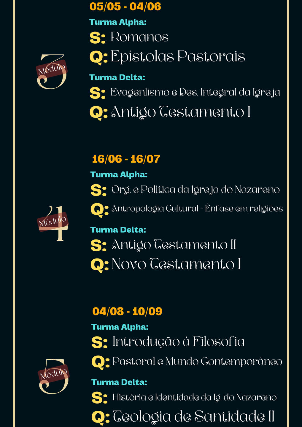 Turma Alpha: As disciplinas dessa turma serão disciplinas do 3º e 4º anos da grade curricular e funcionarão de igual forma como tem sido nos últimos anos, com aulas híbridas (Presencial / Ao vivo via G. Meet);Turma Delta: As disciplinas dessa turma serão disciplinas do 1º e 2º anos da grade curricular e acontecerão apenas de forma online, via Google Meet.